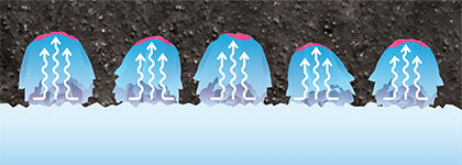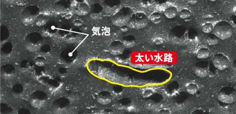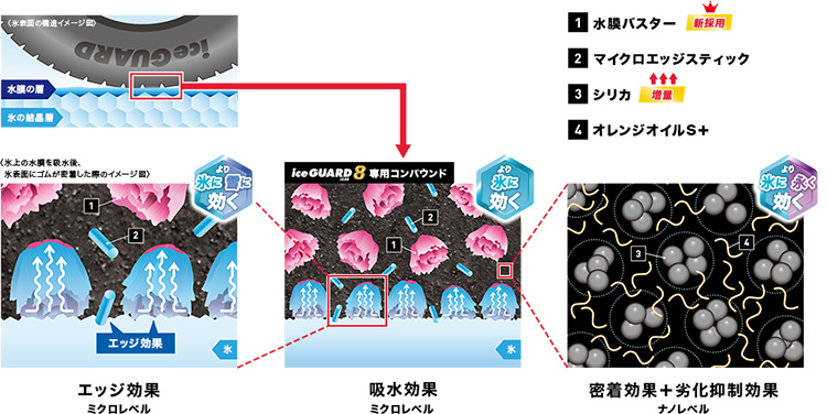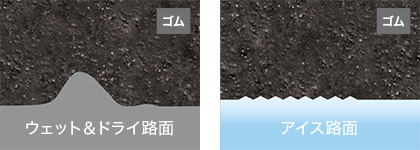 ゴムがやわらかいため氷にしっかり密着。さらに、細かい気泡が路面とタイヤの間にある水膜を除去。