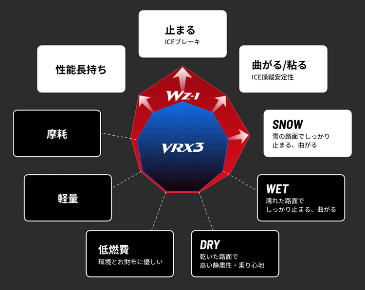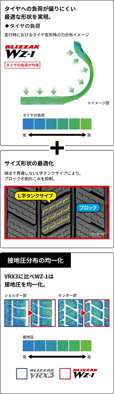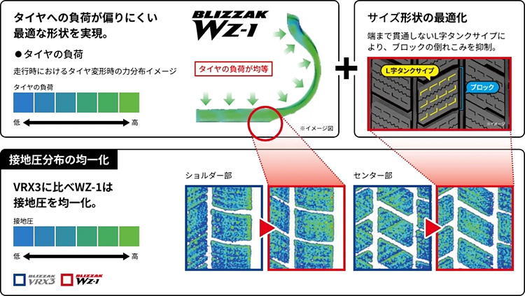 「REGNO GR-XIII」シリーズに搭載されているケースライン最適化技術をブリザック用にカスタマイズした「WZ Motionライン」を適用。これにより接地を最適化することでタイヤ性能を高次元に発揮し、思い通りの走りを実現します。圧雪からシャーベットまで幅広い路面に対応するとともにウェットブレーキ性能を向上、ドライ路面での高い静粛性・乗り心地を提供します。
