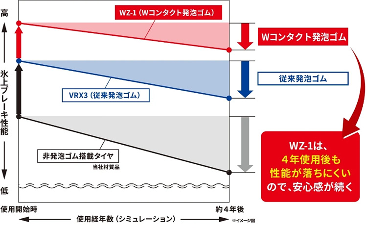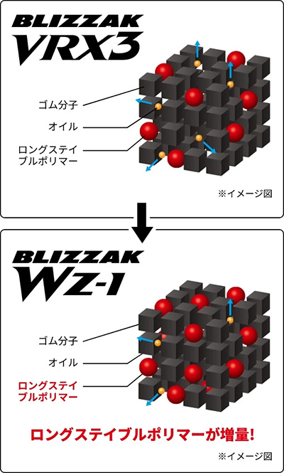 VRX3に比べWZ-1はタイヤのやわらかさに寄与するロングステイブルポリマーの配合量を増やすことで、経年による性能低下を抑制。