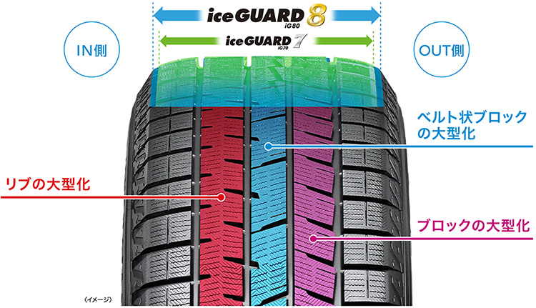 トレッド幅の拡大により実接地面積を8%増加させ、リブとブロックの大型化でブロック剛性を7%増加を達成。アイスガード史上最高の氷上性能を実現しました。
