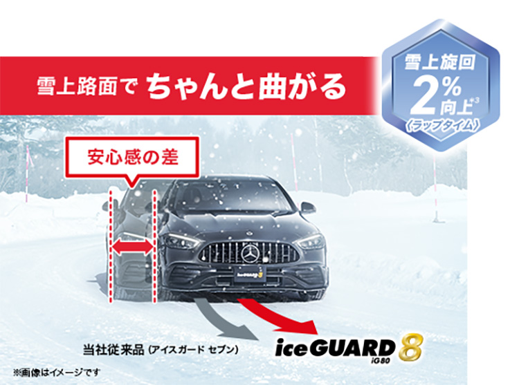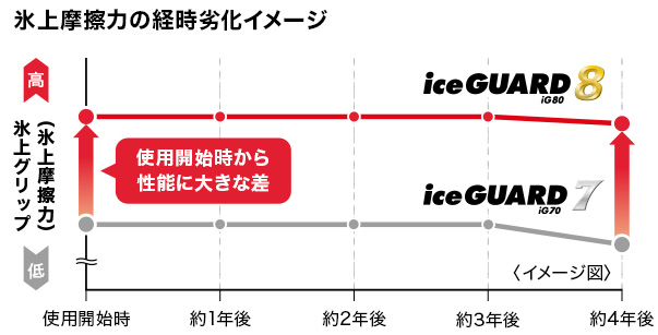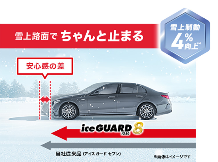 コンパウンドの柔らかさを維持することで“より永く効く”性能を発揮。アイスガード セブンを上回る氷上性能を、より永く楽しむことができます。