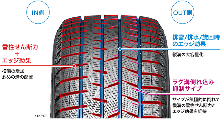 潰れやすい形状のサイプを敢えてラグ溝近くに配置。ラグ溝の代わりに潰れることでラグ溝の変形を抑制し、雪柱せん断力/排雪/排水性を確保します。